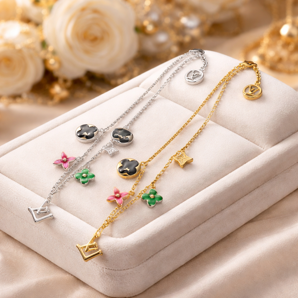 This charm necklace is giving high-fashion vibes with every sparkle. The iconic-inspired charms make it the perfect piece to elevate any outfit—from casual cute to boss-level chic. Inspired “Louis Vuitton”